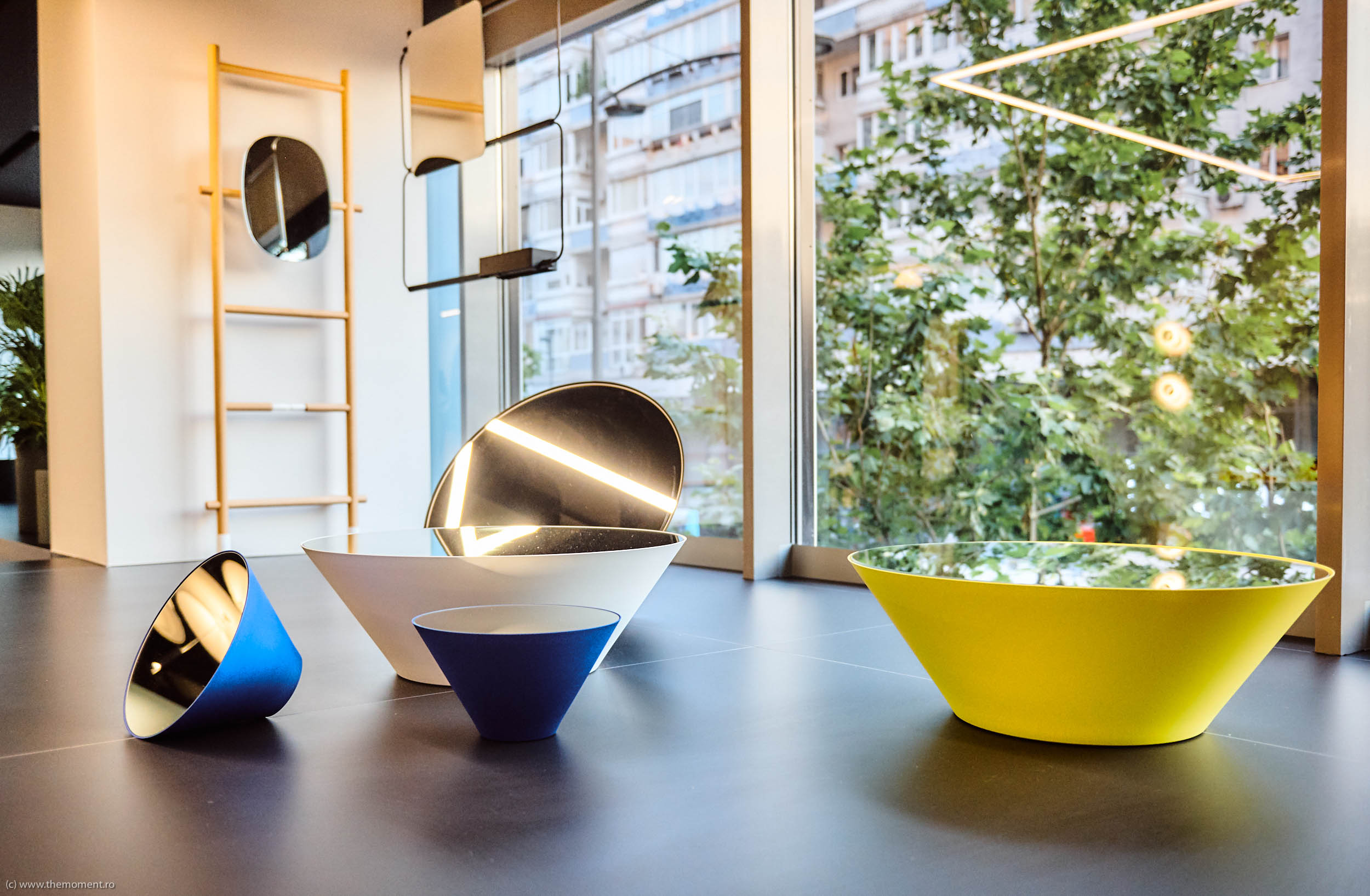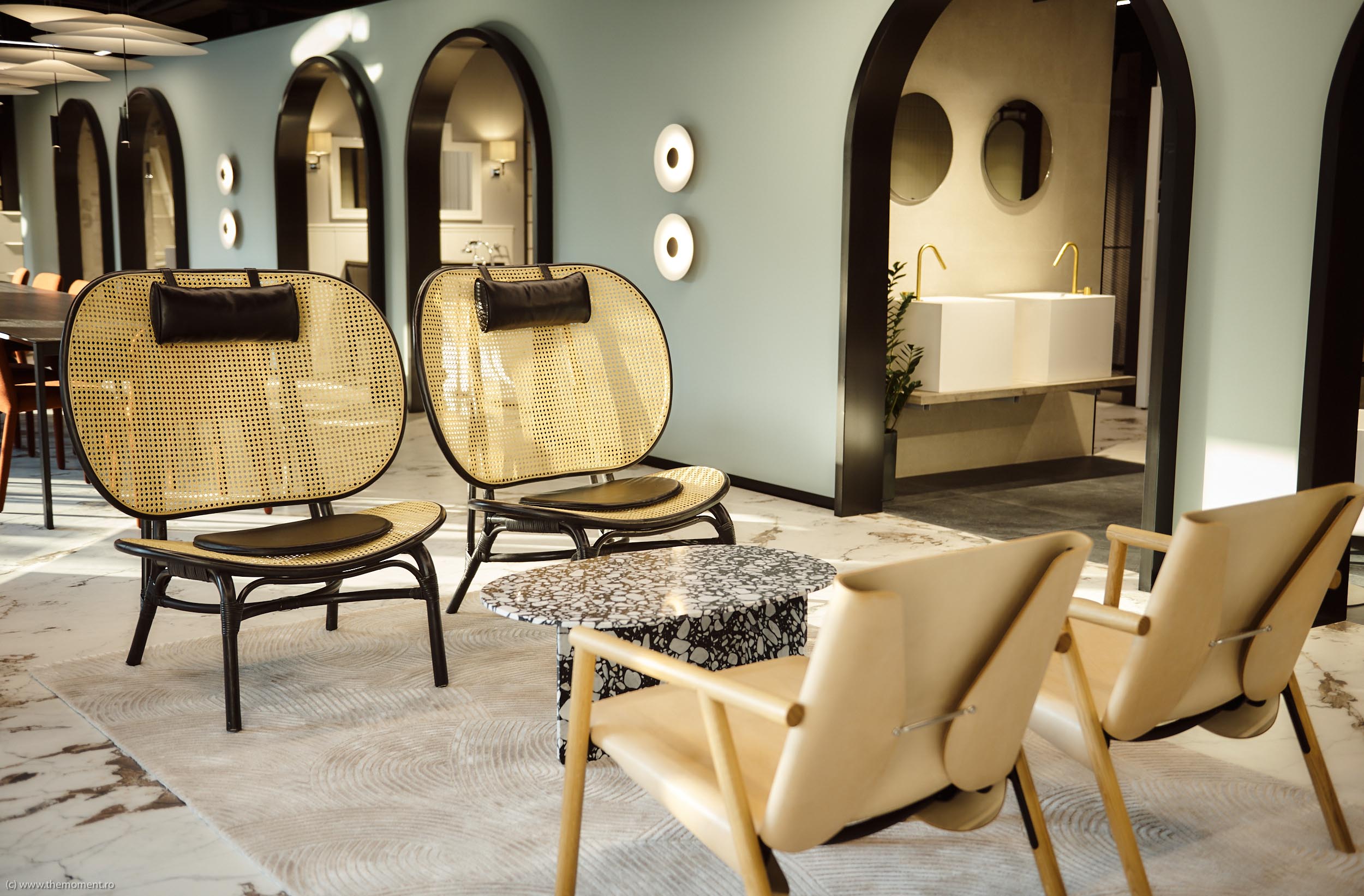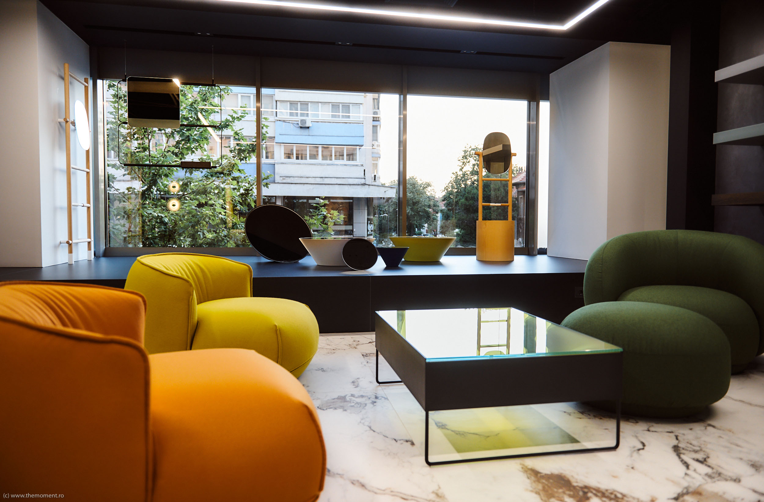Spatiul principal al showroom-ului, vizibil dinspre exterior de-alungul fatadei vitrate, se insereaza ca un layer nou intre spatiul public exterior si spatiul strict comercial de expunere din interior, si devine acel element suplimentar care transforma showroom-ul intr-un concept store focalizat pe relatia utilizatorului cu designul, subliniand importanta dialogului generat si aducand in prim plan importanta intelegerii efectelor designului asupra vietii noastre cotidiene – ca amatori de design, vizitatori sau viitor cumparatori.