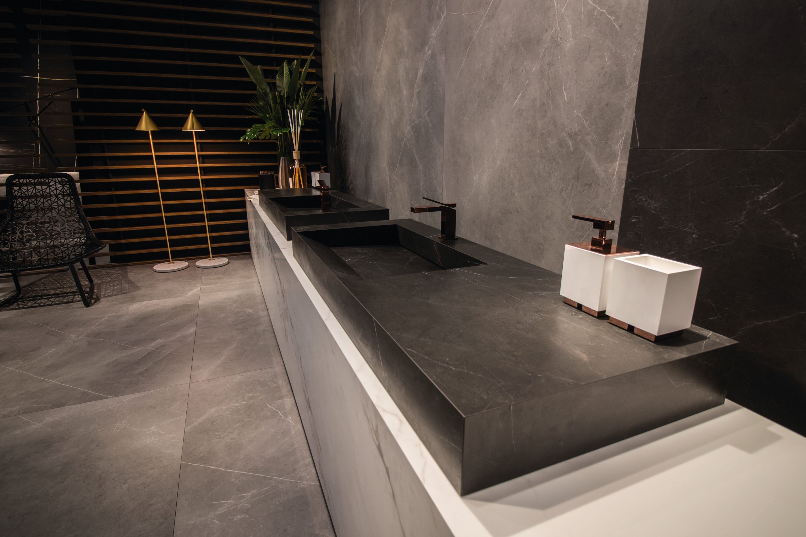Noile tendințe în designul pentru camera de baie reflectă o revenire la minimalism. Însă nu este vorba de un stil auster, ci de unul spectaculos, inovator, inteligent. Spațiile sunt lăsate să respire vizual, prin intermediul placajelor mari, XXL. Sunt prezente finisaje și structuri cu look industrial (lemn, piatră, mar- mură, metal: auriu mat, cupru, inox, bronz), completate cu mobilier, baterii și obiecte sanitare perfect asortate ca finiș, cromatică și geometrie.