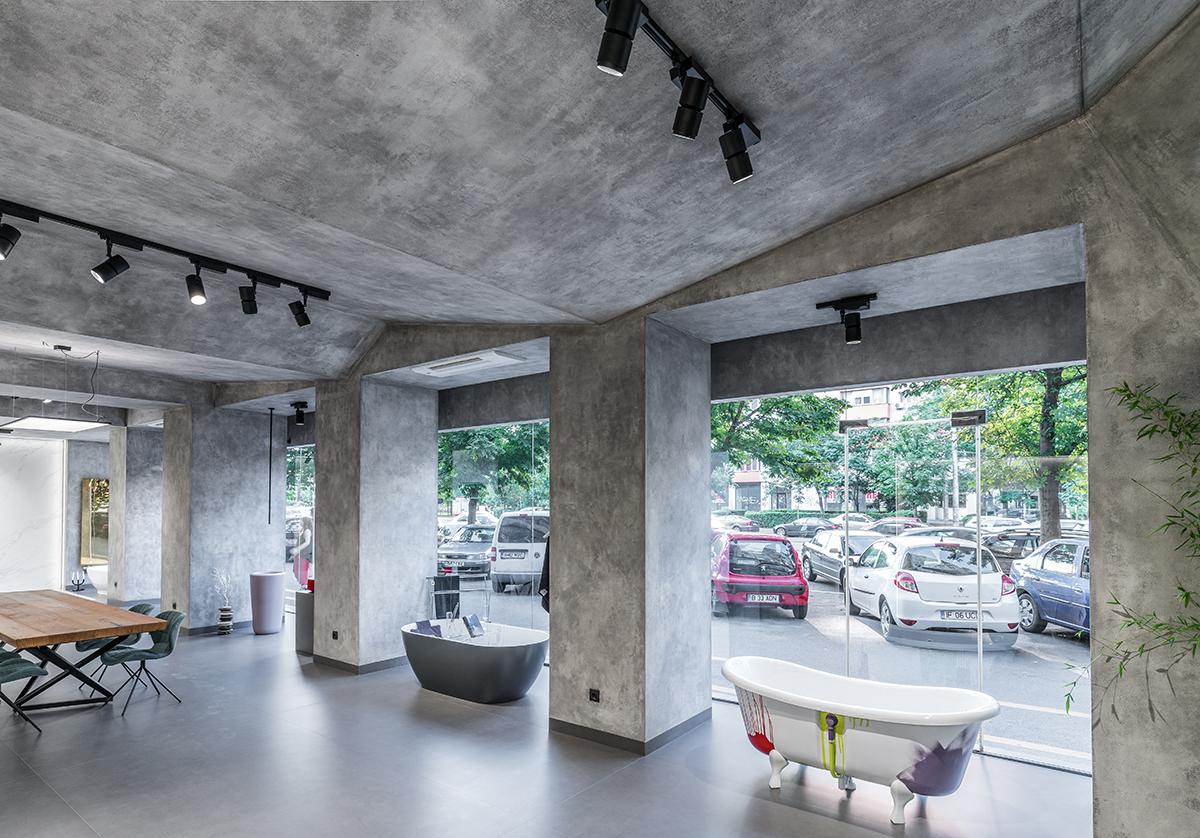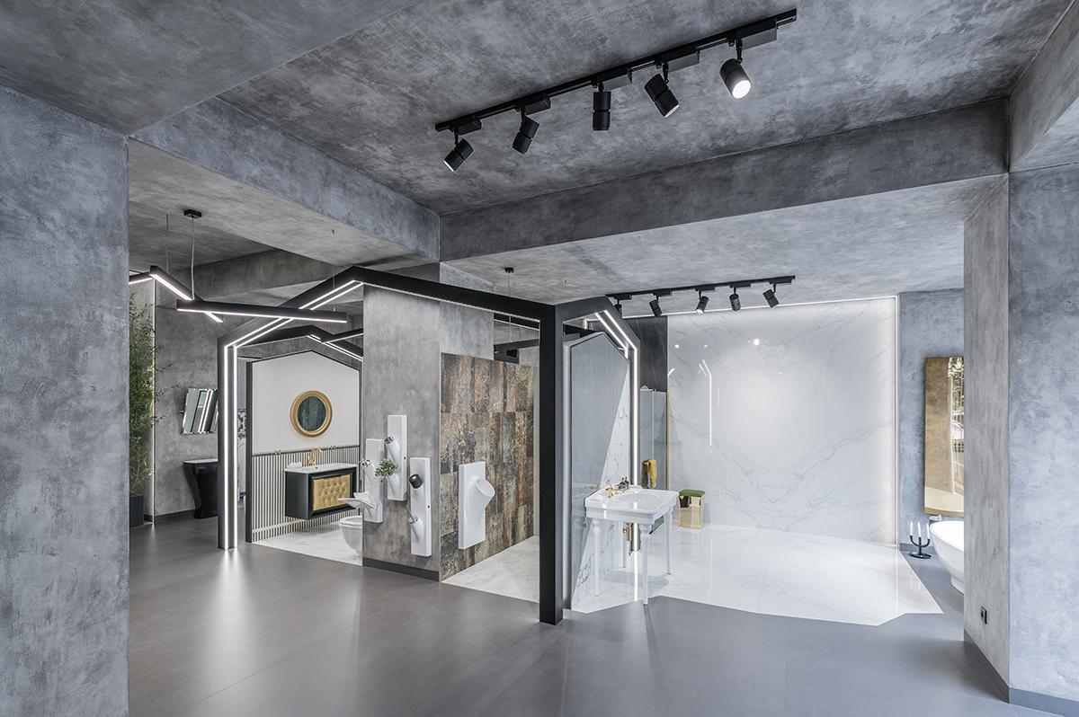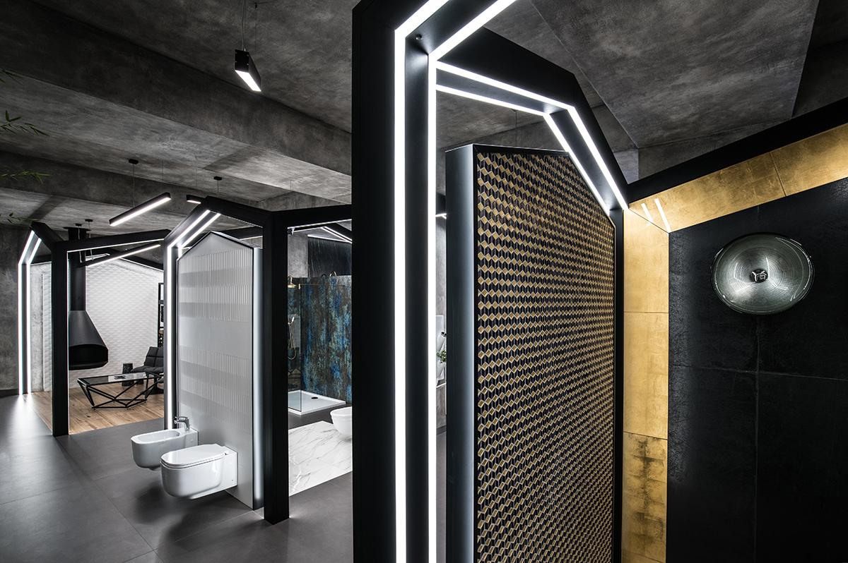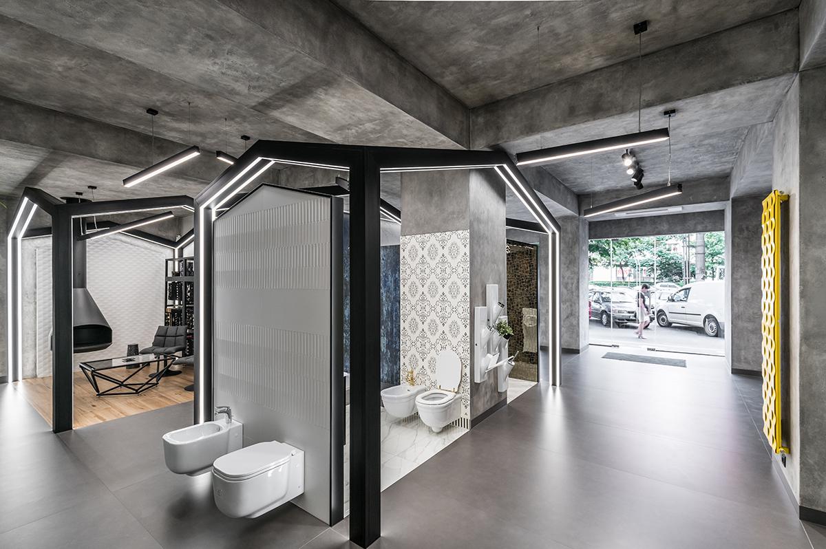 O atenție deosebită a fost acordată, așa cum era de așteptat, zonei care se poate vedea din stradă. Aici, corpurile de iluminat, preiau rolul principal, conturând o atmosferă scenografică ce captează privirile, mai ales după lăsarea întunericului. Cum acesta este și cel mai amplu spațiu din showroom, au fost evidențiate mai multe zone de interes: o zonă a dușurilor funcționale și una de discuții.