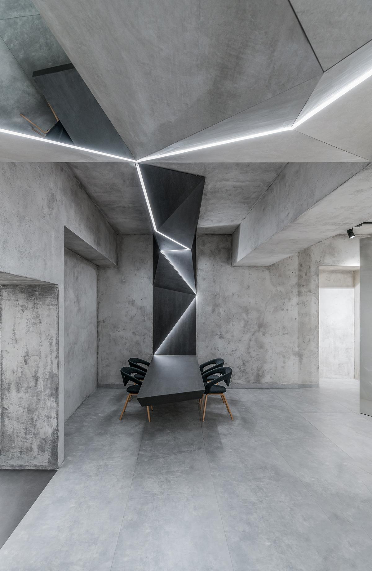 Pentru un efect și mai special, scurgerea apei este dispusă în cascadă. În apropierea mesei de discuții se află și zona de display a unor panouri rotative poziționate vertical, care aproape egalează în înălțime încăperea (3,50 m). Se conturează o senzație de loft industrial, de un anume „acasă”, în care mergi să admiri o multitudine de obiecte plasate la locul potrivit.