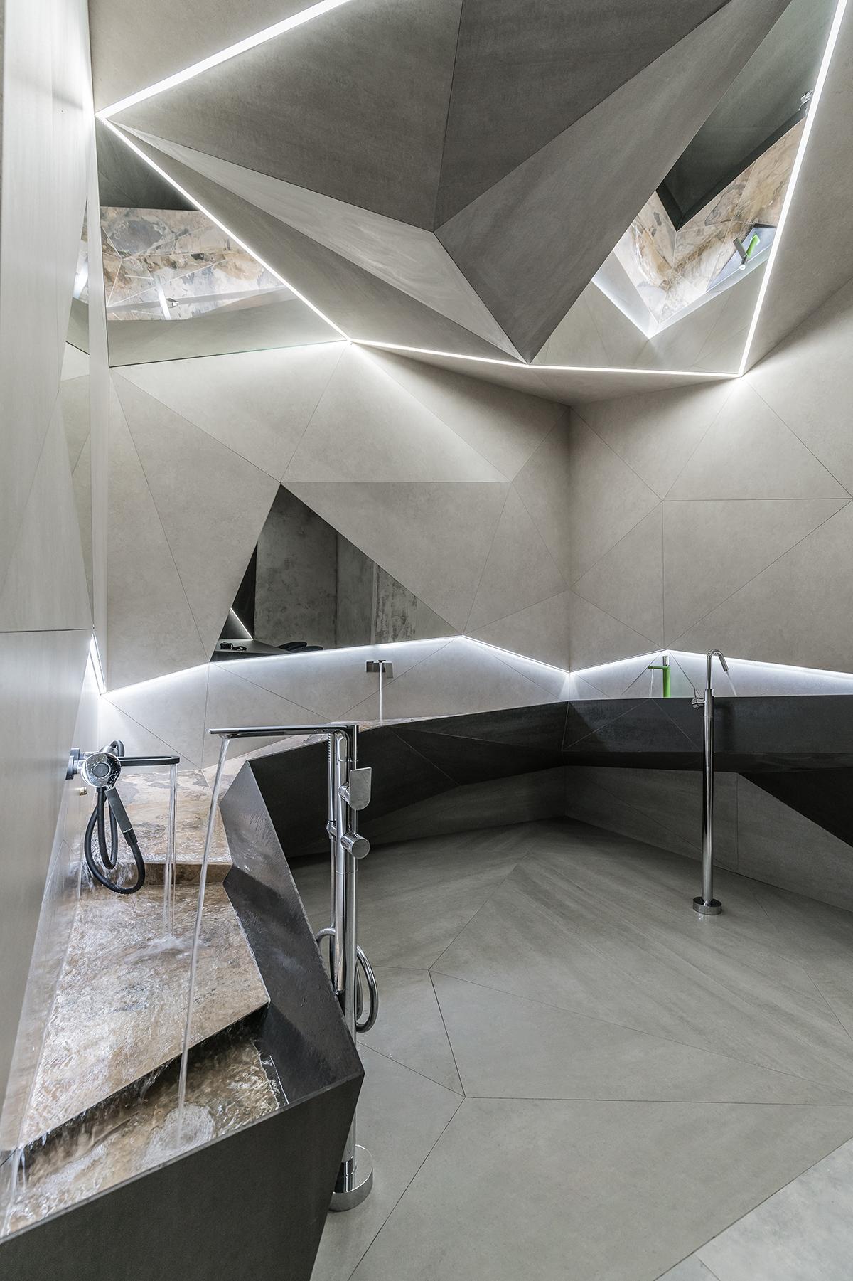 Pentru a rezolva lipsa completă a luminozității în camera din spate, a fost aleasă soluția unui amestec de corpuri de iluminat și suprafețe reflectante. Cu o geometrie aparte, aceasta a fost denumită camera „Slim” datorită placării lavoarului existent aici și a pereților cu plăci slim de 3 mm care se întorc pe tavan.